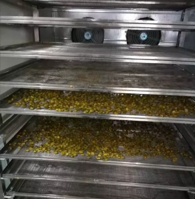 按照6P烘干除濕一體主機配置5.5米長3米寬2.2米高10公分聚氨酯保溫烘干房,安裝8臺循環(huán)軸流風機,一次放入6臺物料車,每車12層,每層裝入新鮮欖錢20斤,每車裝入200-240斤,一批次共裝入1200-1500斤,欖錢烘干溫度可以定的比較高,控制在70度,6P主機的每小時除濕量是25升水,約50斤,欖錢的脫水在6:1左右,按照一次放入1200斤新鮮欖錢計算,需要脫水1000斤,需要20小時,如果在烘干房對面增加一臺25升的純除濕機,可以縮短時間5-7小時,這樣效率就比較高,但是初始投入會增加,這個可以根據客戶自身的需求進行配置。
