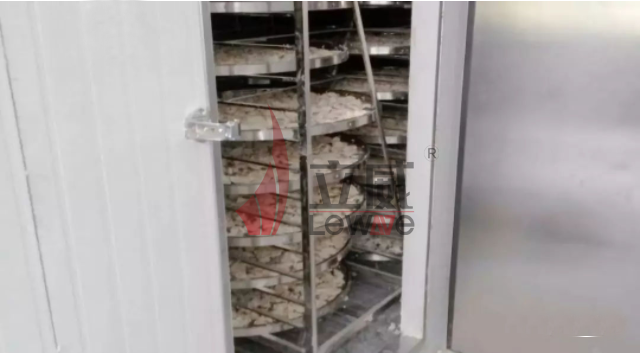 1、將山藥去皮后切成厚薄均勻,大小一致的山藥片,過水處理,瀝干水分后就鋪放到不銹鋼的物料車架上,注意不要起堆,片與片之間要留有一定的間隙。