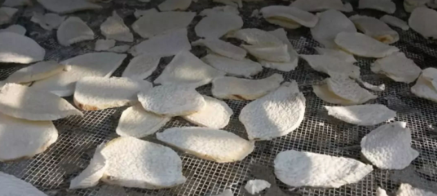 5、隨著溫度的升高,水汽的排出,淮山片的濕度越來越低,當溫度參數(shù)設置在60-70℃時,排濕強度增大,直至將山藥片干燥至含水率約10%,時間需6小時左右,山藥片已烘干完成,用手掰之脆斷,外表和內里干燥均勻。