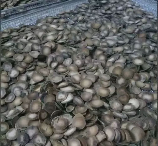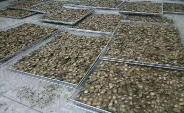 烘干:用烘房烘干,每層上貨厚度控制在2cm~3cm(切片后),每臺物料車放置12-14層,烘干溫度控制在55~60℃,烘干時間約30~36小時,烘干過程中進行連續(xù)除濕,烘至含水分在12%下。在烘干過程,把握住溫度,通過控制溫度使橘紅飲片中高分子鏈條松弛,放入開水容易浸取出來,浸取率達95%以上。如果進行整個烘干,根據(jù)大小進行區(qū)分,每批次烘干時間在4天左右。