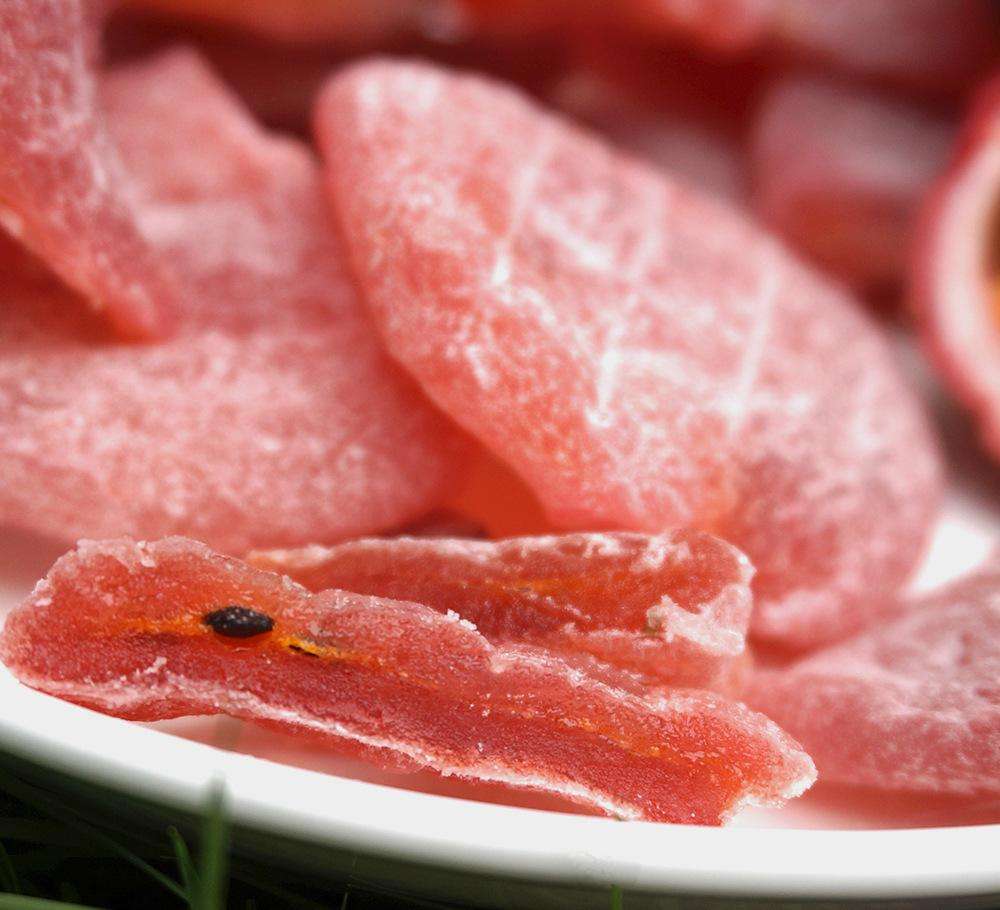 8、糖漬:采用分段糖漬方法,一段糖漬采用白砂糖與麥芽糖的比例是5∶1,時(shí)間為24小時(shí);二段糖漬時(shí)采用白砂糖與麥芽糖的比例是5∶1,同時(shí)添加總重是0.5%的檸檬酸,時(shí)間為24小時(shí);