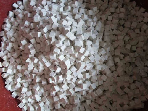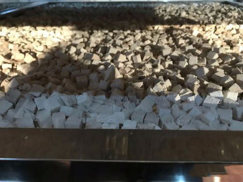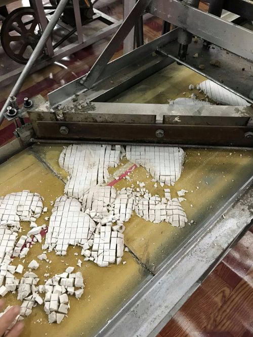 去完皮的茯苓根據(jù)生產(chǎn)需要進行切片或者切丁(茯苓丁一般切成0.8mm*0.8mm的正方形小粒)的工序,一般選擇半自動或者全自動設(shè)備完成。