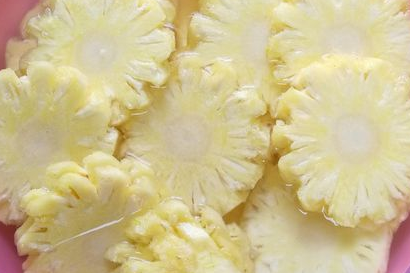 取八成熟菠蘿,果肉已轉(zhuǎn)黃色,具菠蘿芳香,去除爛果、病果、蟲果,用人工或機(jī)械辦法去皮去心去果眼,果肉已轉(zhuǎn)黃色,具菠蘿芳香,切片,每片大小厚度3―4毫米,呈扇狀。