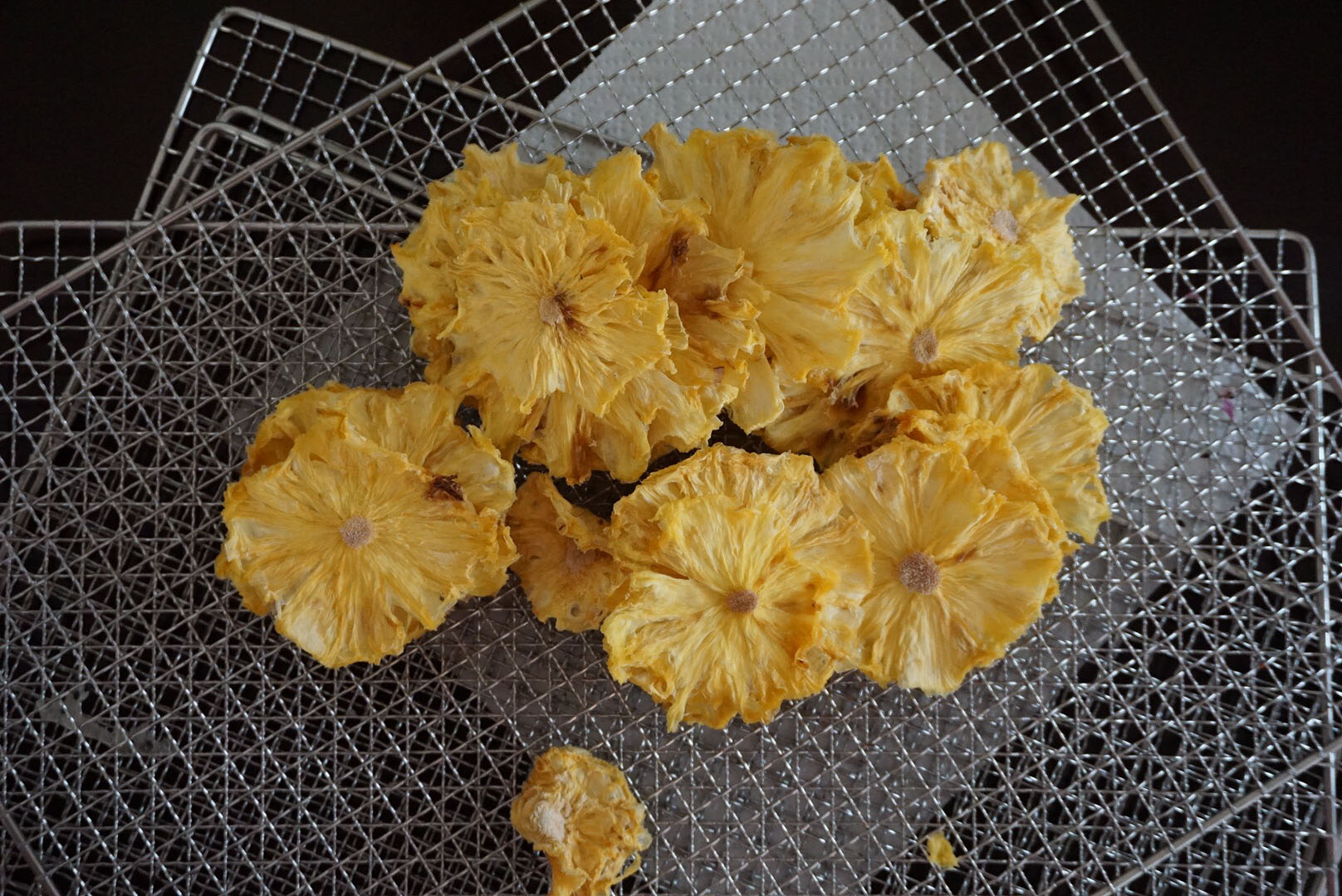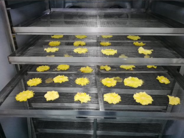 脫水菠蘿的加工技術(shù)相似于芒果干,因?yàn)椴ぬ}果肉組織比較疏松,含水量較多,如果直接干制而得菠蘿干,其缺點(diǎn)是:成品得率很低,而且風(fēng)味欠佳,使用一般干燥方式對(duì)風(fēng)味影響太大。為了提高得率,改進(jìn)制品風(fēng)味,在加工過程中加入部分蔗糖。