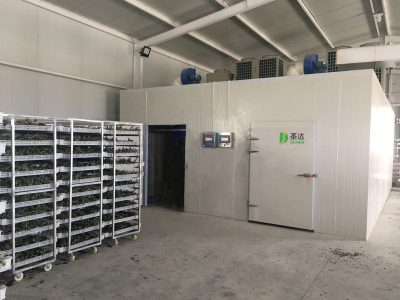 把菠蘿片從糖液中撈起,瀝干水分,在65攝氏度下干燥18―20小時(shí),使其含水量為16%標(biāo)準(zhǔn)。6P烘干除濕一體主機(jī)配置5.8米長3米寬2.2米高10公分聚氨酯雙面彩鋼烘干房,放入8臺(tái)物料車,每臺(tái)物料車15層,每層裝菠蘿片10斤,每臺(tái)車裝150斤,8臺(tái)物料車共裝入1200斤,設(shè)備每小時(shí)耗電7度,一批次總耗電140度,烘干過程分成三段完成,第一段,溫度設(shè)定55度,時(shí)間2小時(shí),連續(xù)加熱,循環(huán)內(nèi)風(fēng)機(jī)連續(xù)工作,進(jìn)入第二段,溫度62度,時(shí)間8小時(shí),濕度設(shè)定35%,模式選擇烘干+排濕,進(jìn)入第三段,溫度提升到65度,時(shí)間設(shè)定8小時(shí),濕度設(shè)定20%,模式采用烘干+排濕,全過程選用干濕球傳感信號(hào)控制濕度,溫度探頭傳感信號(hào)控制溫度。