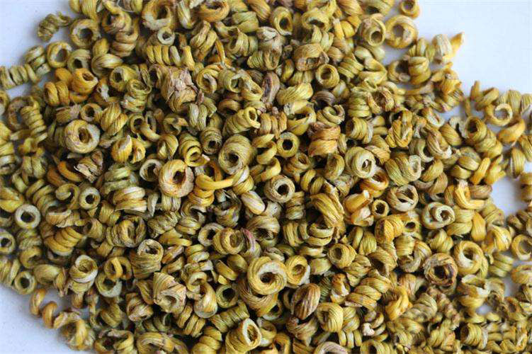 2、在業(yè)內(nèi),將加工完成的金黃色且長(zhǎng)度為一寸的石斛干條,稱為寸金,將干燥后呈現(xiàn)金黃色且卷曲呈螺旋狀或彈簧狀的石斛成品,稱為楓斗。在加工時(shí),為使含水量大且直條的新鮮石斛易于卷曲,還是要費(fèi)一番功夫的,首先要炒制或低溫烘焙,再稍加均勻的手力搓揉,去除鮮條中部分水分,讓其慢慢變得柔軟。