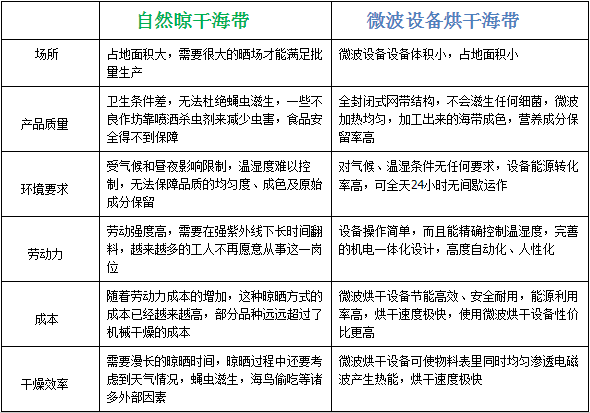 海帶的烘干方式很多,傳統(tǒng)的烘干方式往往采用自然晾曬烘干,而新式的微波烘干越來越受到海產(chǎn)品加工業(yè)的追捧,下面我們從多方面切入,對比一下這兩種比較典型的烘干方式: