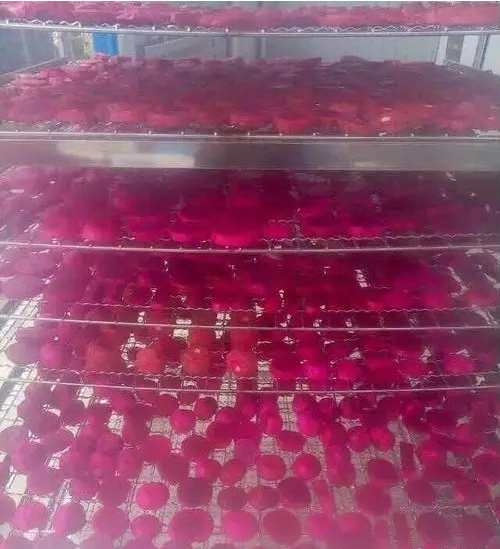5、推進火龍果烘干機內(nèi)進行烘烤。使用火龍果烘干機(空氣能烘干設(shè)備)進行烘烤。將浸糖后的火龍果片裝盤,放上物料車,推進烘干房內(nèi),烘至果片表面糖漿不再粘滯為合適。