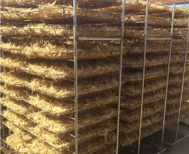 4、晾曬:洗刷凈的鮮參,按大、中、小分別單層擺放在烘干盤上。擺后送入室烘干。