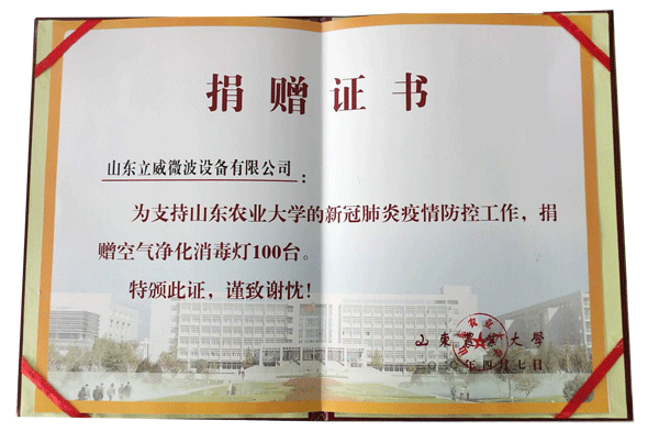 大疫無情,人間有愛!4月14日山東農(nóng)業(yè)大學(xué)校醫(yī)院院內(nèi),山東立威微波設(shè)備有限公司向山東農(nóng)業(yè)大學(xué)捐贈(zèng)空氣凈化消毒燈100臺(tái),幫助學(xué)??箵粢咔?、助力做好開學(xué)復(fù)課準(zhǔn)備工作。